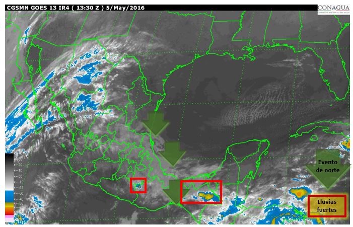 Se registrará evento de “norte”, con rachas de viento de 50 a 60 kilómetros por hora, en Veracruz, Tabasco, Campeche, Yucatán, Quintana Roo e Istmo y Golfo de Tehuantepec (Oaxaca y Chiapas).