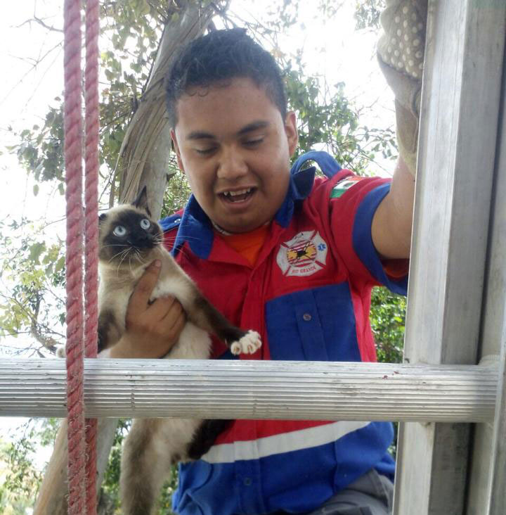 Vecinos de la calle Glafiro Alemán de esta ciudad de Río Grande, reportaron a la Unidad de Protección Civil y Bomberos un gato atrapado en un árbol, ante lo cual los elementos de esta corporación se dieron a la tarea de rescatar al felino que luego de hacer peripecias en el árbol, ya no pudo bajar de el y los vecinos al ubicarlo en tales condiciones optaron por llamar a los bomberos municipales quienes atendieron con todo profesionalismo el llamado, rescatando sano y salvo al felino y entregandoselo a su dueña, quien agradeció al igual que los vecinos quienes reconocieron con aplausos a los tragafuego por el esfuerzo realizado.
