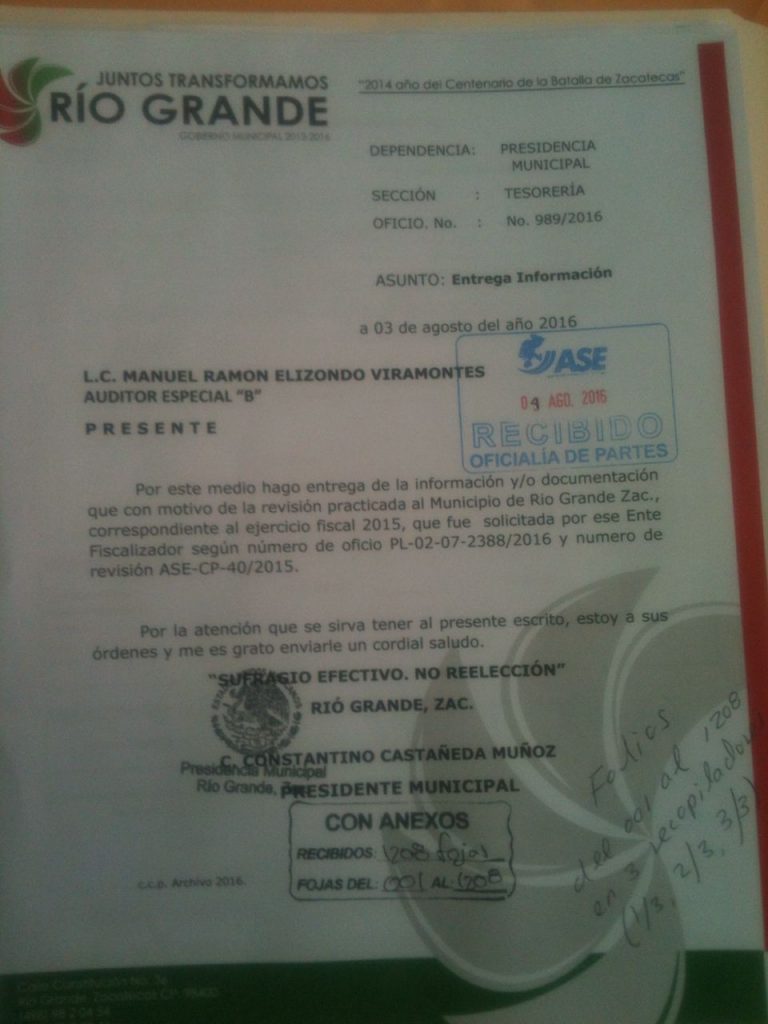 Para cumplir con lo pactado con este ente fiscalizador, se presentó en tiempo y forma la cuenta pública con la intención de que se realice el análisis fiscal en Río Grande del ejercicio 2015, la cual fue presentada con folios, firmas y sellos en la capital zacatecana.