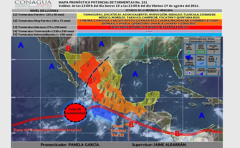 Se pronostican, para hoy, lluvias muy fuertes, de 50 a 75 milímetros (mm), con tormentas intensas (de 75 a 150 mm) en áreas de Coahuila, Sinaloa, Nayarit, Jalisco y Colima; lluvias fuertes (de 25 a 50 mm) con tormentas muy fuertes (de 50 a 75 mm) en sitios de Sonora, Chihuahua, Durango, Zacatecas, Nuevo León, San Luis Potosí, Michoacán, Guerrero y Oaxaca, y chubascos (de 5.1 a 25 mm) con tormentas fuertes (de 25 a 50 mm) en regiones de Aguascalientes, Tamaulipas, Estado de México, Tlaxcala, Morelos, Querétaro, Guanajuato, Hidalgo, Ciudad de México, Puebla, Chiapas, Tabasco y Veracruz, informó la Comisión Nacional del Agua (Conagua), a través del Servicio Meteorológico Nacional (SMN).