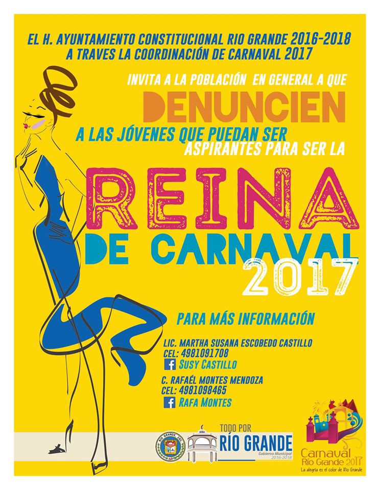 El Ayuntamiento Municipal 2016-2018 a través de los coordinadores de la máxima fiesta de los riograndenses el “Carnaval Rio Grande 2017”, publicaron la convocatoria abierta a la población para que “Denuncie a las jóvenes que puedan ser aspirantes para ocupar la máxima distinción de las fiestas, ser la Reina de Carnaval”.
