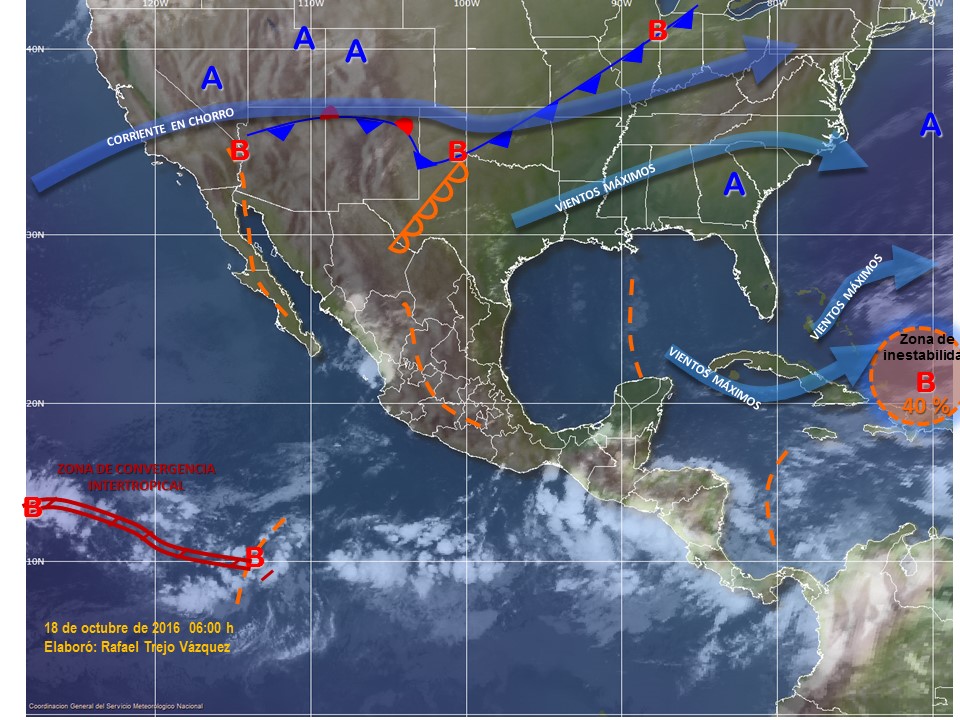 Para hoy, se mantendrán canales de baja presión sobre el interior del Territorio Nacional y el sureste de México, lo que producirá tormentas puntuales muy fuertes en Chiapas; tormentas fuertes en Estado de México, Ciudad de México, Tlaxcala, Guerrero, Veracruz, Oaxaca y Quintana Roo; lluvias con intervalos de chubascos en Chihuahua, Durango, Sinaloa, Nayarit, Jalisco, Colima, Michoacán, Guanajuato, Morelos, Puebla, Tamaulipas, Tabasco, Campeche y Yucatán, y lluvias escasas o lloviznas en Nuevo León, San Luis Potosí, Zacatecas, Aguascalientes, Querétaro e Hidalgo.