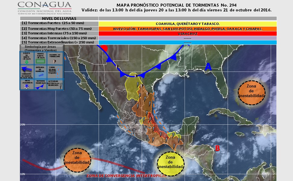 Este día, continuará el potencial de tormentas intensas en San Luis Potosí, Hidalgo, Puebla, Veracruz, Oaxaca, Tabasco y Chiapas; tormentas muy fuertes en Tamaulipas, Querétaro y Tlaxcala, tormentas puntuales fuertes en el Estado de México, Guerrero y Nuevo León; lluvias con intervalos de chubascos en Zacatecas, Nayarit, Jalisco, Colima, Guanajuato, Michoacán, Ciudad de México, Morelos, Campeche, Yucatán y Quintana Roo, y lluvias escasas en Baja California Sur, Sonora, Sinaloa, Aguascalientes, Chihuahua, Coahuila y Durango, esto es favorecido por el frente frío No. 4 y una zona de inestabilidad con potencial ciclónico al sur de Oaxaca. La masa de aire frío asociada al frente, mantendrá temperaturas frías en la mayor parte del país, excepto en el litoral del Pacífico, además de originar evento de “Norte” con rachas de viento de 60 a 80 km/h en el litoral del Golfo de México, de hasta 50 km/h en la Península de Yucatán, y rachas podrían alcanzar los 90 km/h en el Istmo y Golfo de Tehuantepec.