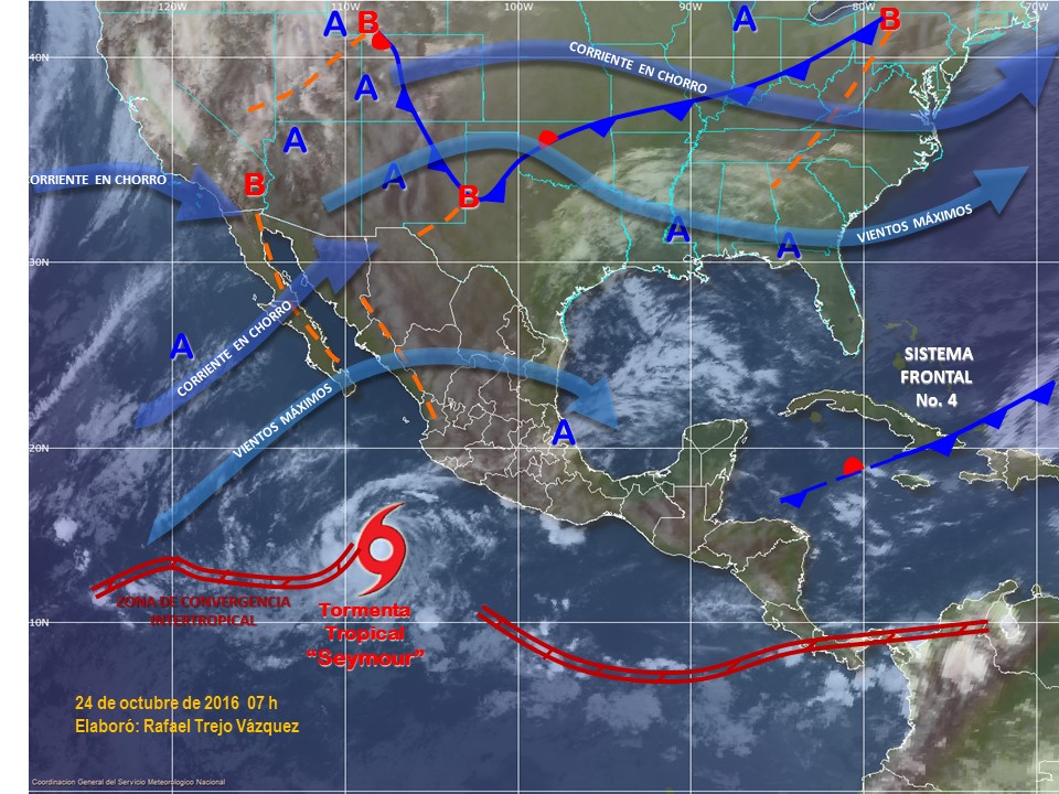 Para hoy, un canal de baja presión se mantendrá en el sureste del país, lo que originará potencial de tormentas intensas en Veracruz; tormentas muy fuertes en Chiapas; tormentas fuertes en Oaxaca y lluvias con intervalos de chubascos en Tamaulipas y Tabasco. Mientras tanto, los desprendimientos nubosos de la tormenta tropical Seymour que se localizará al suroeste de las costa de Jalisco, se extenderán hacia el occidente del territorio y producirán potencial de lluvias fuertes en Jalisco, Colima y Michoacán; lluvias con intervalos de chubascos en Nayarit y lluvias escasas o lloviznas en Baja California Sur.