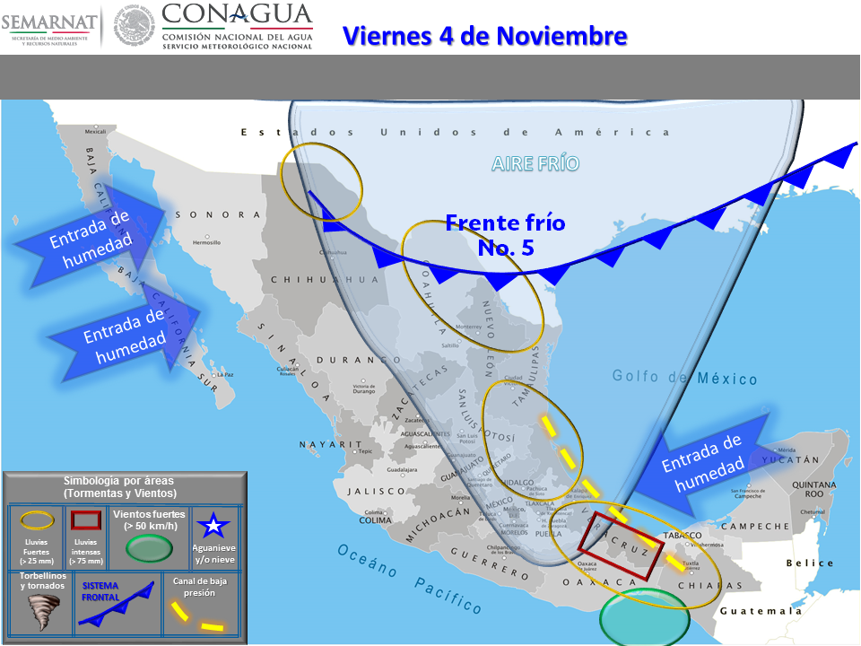 Este día, el sistema frontal No. 5 y la persistencia de una área inestable sobre el sureste del territorio, mantendrá el temporal de lluvias intensas en Veracruz, Oaxaca y Chiapas; tormentas puntuales muy fuertes en Puebla, Tamaulipas y Tabasco, tormentas puntuales fuertes en Chihuahua, Coahuila, Nuevo León, San Luis Potosí y Querétaro, lluvias con intervalos de chubascos en Jalisco, Michoacán, Estado de México, Ciudad de México, Guanajuato, Hidalgo, Guerrero, Campeche y Quintana Roo, así como lluvias escasas en Durango, Zacatecas, Aguascalientes, Nayarit, Morelos, Tlaxcala, Colima y Yucatán; se mantendrán temperaturas bajas sobre el interior del país, además de vientos fuertes con rachas que pueden superar los 60 km/h en la porción norte del país y de 70 km/h en el Istmo de Tehuantepec.