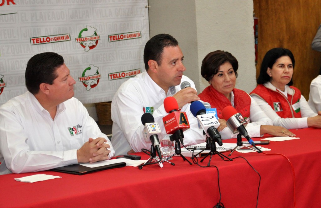 Durante su encuentro con los representantes de los medios de comunicación, Alejandro Tello estuvo acompañado el líder estatal del PRI, Adolfo Bonilla Gómez, por su coordinador de campaña, Francisco Escobedo y los candidatos a la alcaldía capitalina y diputaciones locales.