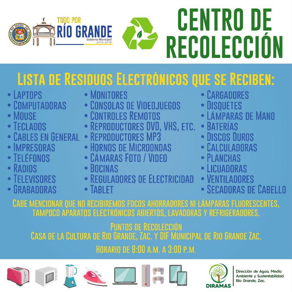 “Laptops, computadoras, mouses, teclados, cables en general, impresoras, radios, televisores, grabadoras, monitores, consolas de videojuegos, controles remotos, videocaseteras, reproductores DVD, vhs, mp3, hornos de microondas, cámaras foto y video, bocinas, reguladores de electricidad, tables, cargadores, disquetes, lamparas de mano, baterías, discos duros, calculadoras, planchas, licuadoras, ventiladores y secadoras de cabello, etc.; son los residuos electrónicos que serán recibidos en los centros de recolección, en ellos habrá personal que se encargara de llevarlos a los centros especializados para su destrucción o reciclaje; no se recibirán focos ahorradores, aparatos electrónicos abiertos y lavadoras y refrigeradores”, agrego el titular del Agua, Medio Ambiente y sustentabilidad de Rio Grande.