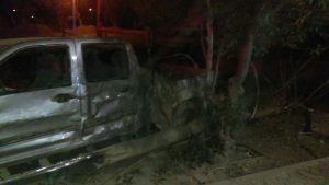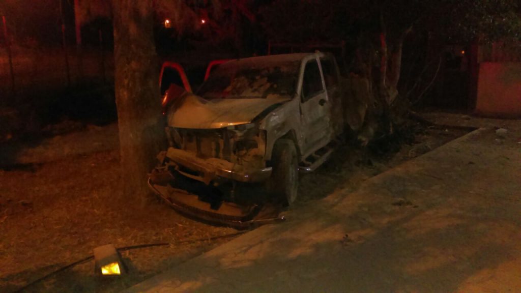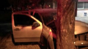 Cuantiosos daños materiales arrojo un accidente tipo choque registrado la madrugada del viernes, donde una camioneta Colorado modelo 2007 color beige con placas de Texas, se impacto contra un poste de energía eléctrica y terminó su loca carrera entre dos árboles, por fortuna para el conductor, ya que de no haber sido así, habría terminado al interior de las oficinas de la Comisión Federal de Electricidad.