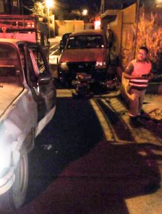 Desafortunadamente los hechos no pararon ahí, ya que luego de atropellar a la persona en mención, la camioneta sin frenos se impacto con otra camioneta marca Ford Ranger modelo y por poco atropella también al propietario de esta última, de nombre Juan Carlos “N”, quien acaba de descender del vehículo para abordar una motocicleta, y haciendo gala de su habilidad física logro penderse de una malla ciclónica que bordea un predio, quedando colgado de la misma, acción que le salvo la vida.