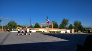 La bandera a media asta de la plaza cívica fue el escenario para que los alumnos de las instituciones educativas rindieran homenaje a los estudiantes caídos durante la intervención de los militares en la plaza de las Tres Culturas